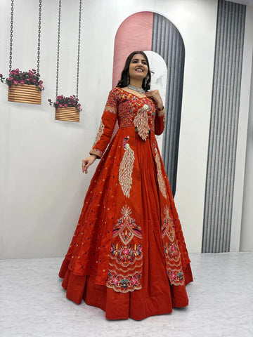 Heavy Frandy Silk Embroidered Gown Lehenga Set with Full Sleeves and Lace Border Dupatta – Ready to Wear