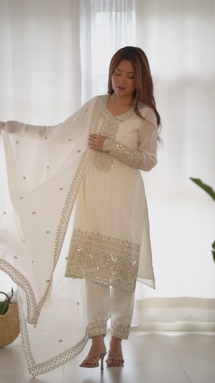 A perfect blend of grace and festive elegance, this premium Chinon Silk kurta set is designed to give you a rich ethnic look with comfortable wear. The beautiful embroidery sequence and zari detailing on the yoke, sleeves, and bottom add a luxurious touch, while the matching embroidered dupatta completes the look perfectly.